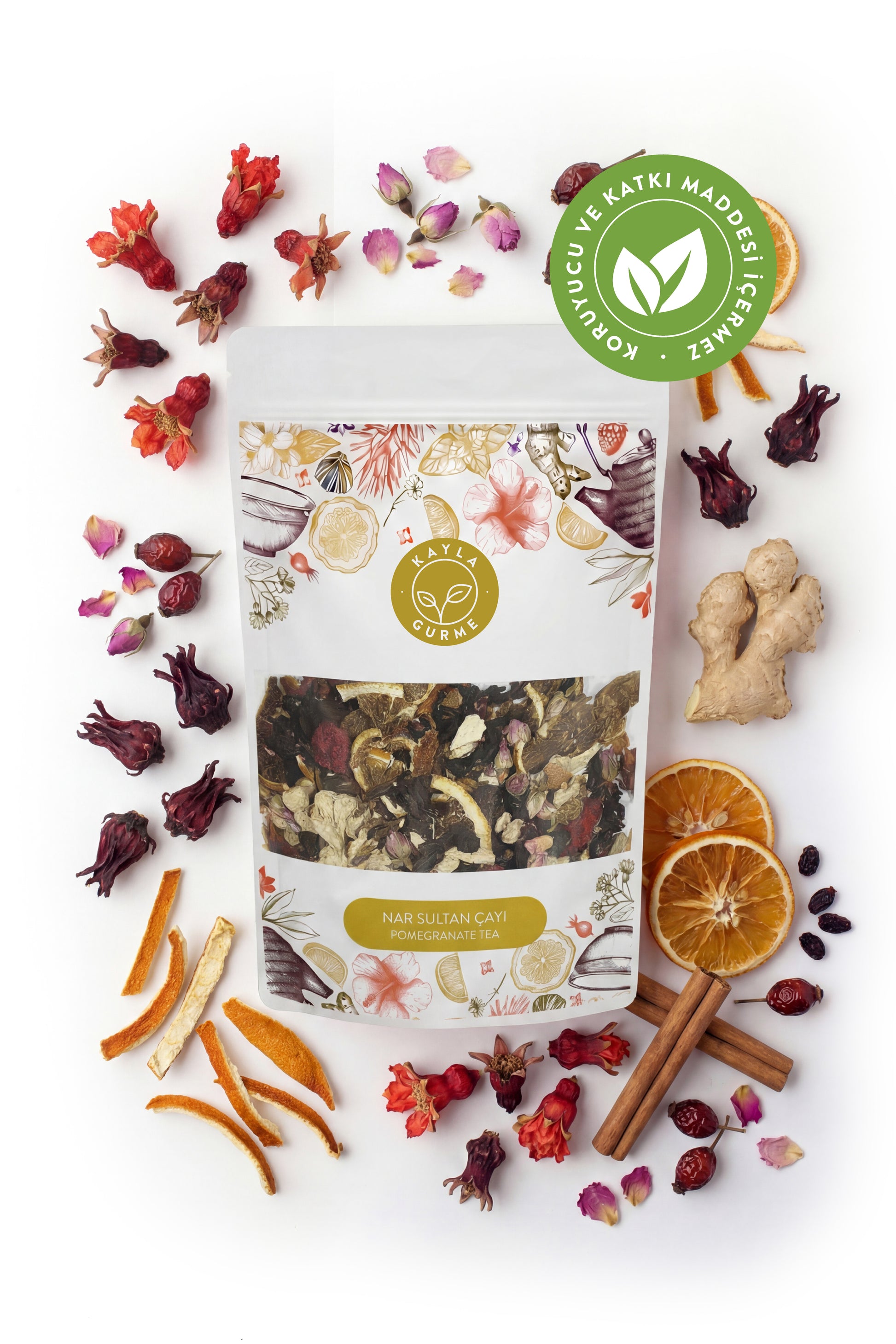 İçindekiler: Nar Çiçeği, Pembe Gül, Hibiskus, Kuşburnu, Portakal Kabuğu, Tane Zencefil, Portakal Dilimi